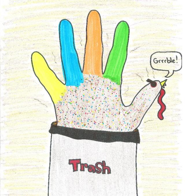 This is Terrence, the disgruntled trash turkey. He is a very mean turkey. He is so mean that instead of saying “Gobble!” like most happy turkeys, he shrieks “Grrrble!” He has taken temporary refuge in our trash can until Thanksgiving is over. Don’t look for him, for he is not sociable, and he might bite. He is also smelly, probably because he’s in the garbage. This deranged turkey also has fangs and red eyes. Don’t ask me why, because I don’t know. He’s some kind of freak of nature.