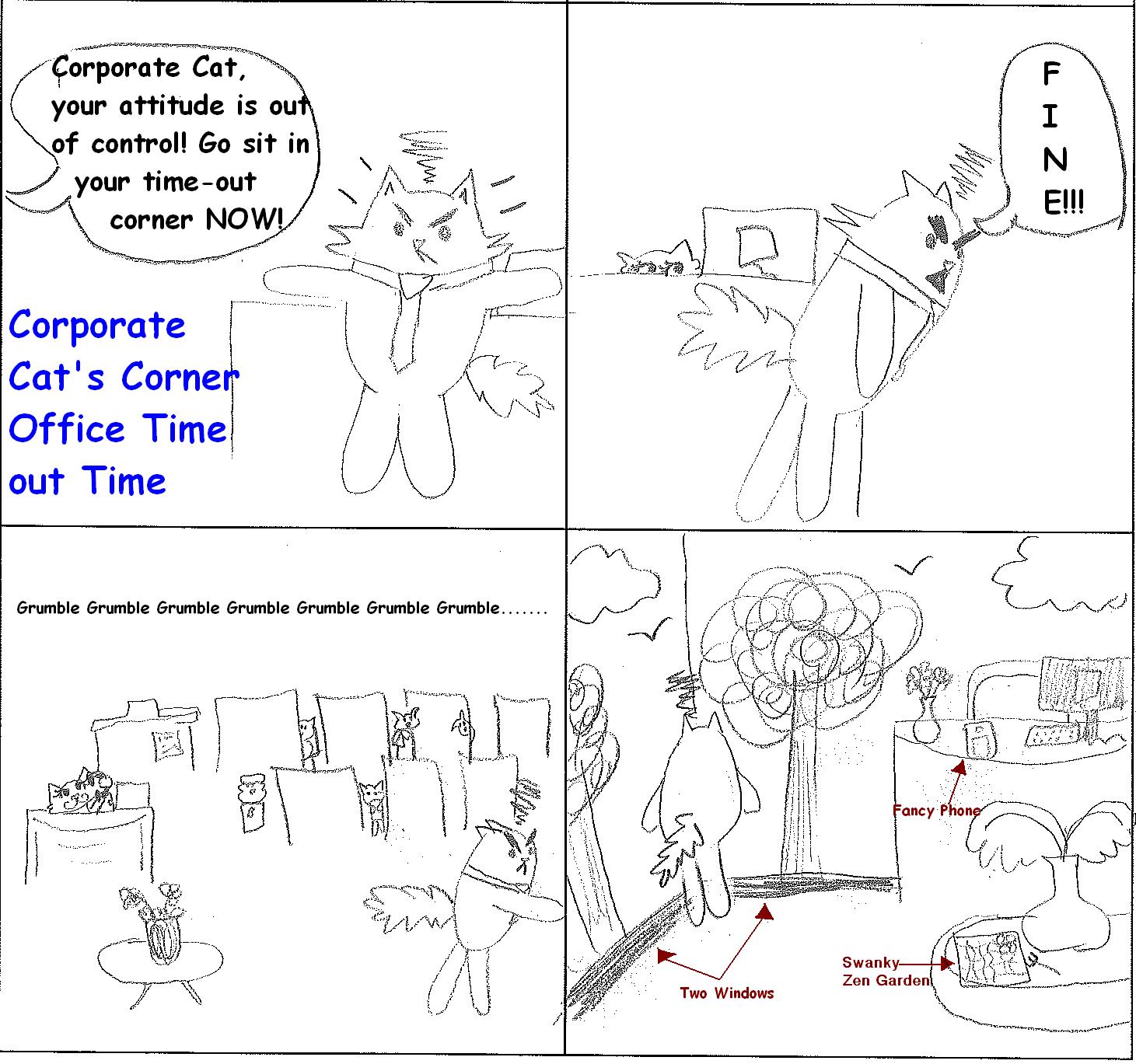What bugs me most about leaving is when my replacements get trolled and bullied in my stead. There was a diva moment about that package, and there was also some epic “Get me Starbucks” drama that went down. Just hearing the stories made me angry, so I that made me feel extra bad for her because she was insulted and clueless as of what to do. I don’t like it when people look down on me or my girls because of our position. I mean, who do you think you are? Somebody needed a time-out yesterday. I then thought about time-out corners, and then I thought about how we should devote an office to be a time out corner. I then thought about spoiled kids being sent to their rooms and how angry they get, despite the fact they have video games and tv in there. This brings me to this final idea: Time-out in the Corner…office. I felt the need to express this idea with a bad cat comic:
