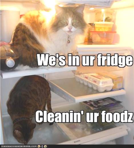 Shoving my cats in the fridge and taking pictures of them was not as easy as I anticipated. I got two shots before they devoured the treats and scampered-off. It was much harder to get them to fill out that job application and sign it though. Those cats are lazy!