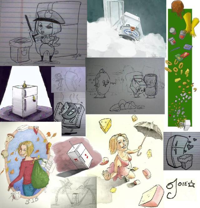 Not long after that, Joie was bored at work and decided to do an illustration for one of my fridge poems, the sonnet. While we both worked in offices, she would sketch the drawing, take a pic of it with her phone and text it to me. Joie finally escaped the office apocalypse and fled to grad school (Lucky duckie!), and we’ve done all our work together via text, Facebook and e-mail. Joie has enjoyed using the fridge illustrations to practice techniques in Photoshop. Things progressively got bigger, better and more outlandish (kind of like us), and suddenly, what started as a series of quickly sketched jokes turned into a serious affair. I have two of her pieces (a print of Kicking it Old School and the original of It’s Raining Cheese) hanging in my house.