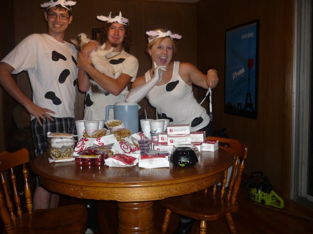 Yesterday was the best holiday of the hear: Cow Appreciation Day. Yes, it beats Christmas. I love the good vibes, creativity, puns and free food that Cow Day has to offer. I rocked out some knee-high socks under my sexy boots. Then I wore one white glove, Michael Jackson style, and some shorts and a tank. I also designed hats for my boys and myself. I made a PDF template, if any of you want to borrow it next year. With the help of my husband and my brother, our herd hit nine Chick-fil-a stores! We also delivered chicken to my brother from another mother, Kendall, since he had to work a double and could not join the stampede.