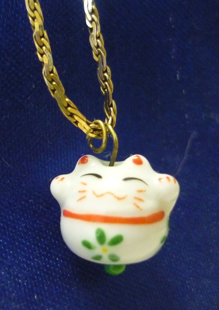 If that’s not weird enough, the craziest thing happened to me last weekend. My favorite necklace has been missing for months. It is a simple piece, a little, glass, good-luck cat (maneki neko) bead on a gold chain. The trinket was actually part of a set of earrings Nick bought for me while in Japan. I lost one earring and decided to thread the remaining kitty onto a necklace. I looked high and low for it, and I even searched all my stored handbags on Saturday morning to see if I took-it-off and stuck it in my purse at some point.