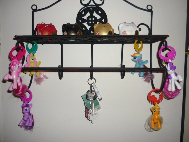 First off, I have to give a “SQUEE,” and a Shout Out to my friend David for giving me all the McDonalds MLP:FIM toys. Even better and in the spirit of Prentice, he didn’t pay for them. Nope. While on vacation in Vegas, he saw a guy taking down the pony display at McDonalds and took it off the employee’s hands. David wanted to bring the whole display to me, but alas. It did not fit in his luggage. Still, his thoughtfulness and resourcefulness totally made my day! Now my collection is complete, and my kitchen and key rack has a very classy (and magical) pony motif.