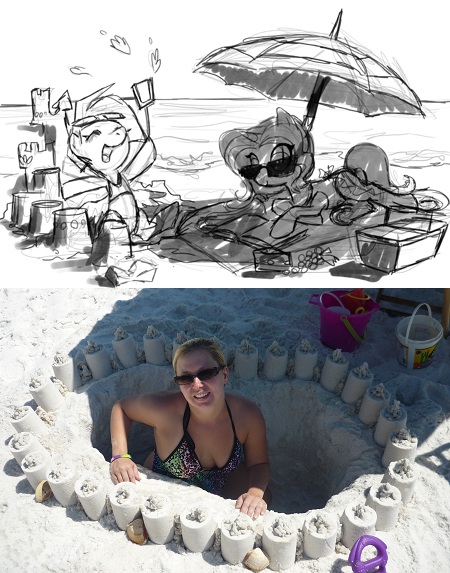 The next day, Joie, her folks and I were off to Destin Florida. We got one nice beach day before Hurricane Issac threw-up all over our vacay. I dug and built a fort around myself while Joie read a book. When it was raining, I did a little writing, and Joie started a fairly accurate depiction of our beach day…as our pony personas, Stardust Rush and Stawty Sprinkles. I can’t wait to see it finished! We also played games and watched movies. It was relaxing, even if the weather was not ideal.